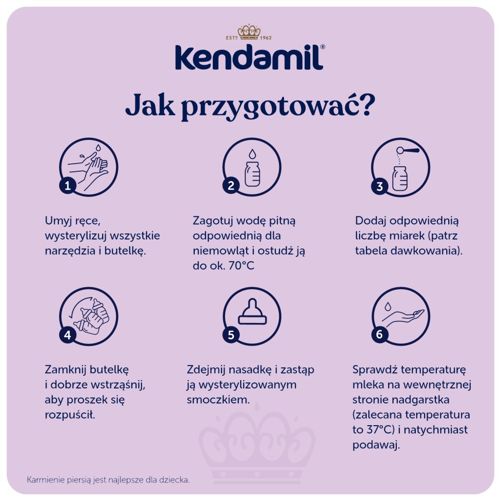 Kendamil Premium 3 HMO+ = 90 ml przegotowanej wody + 3 płaskie miarki (13,8 g proszku).