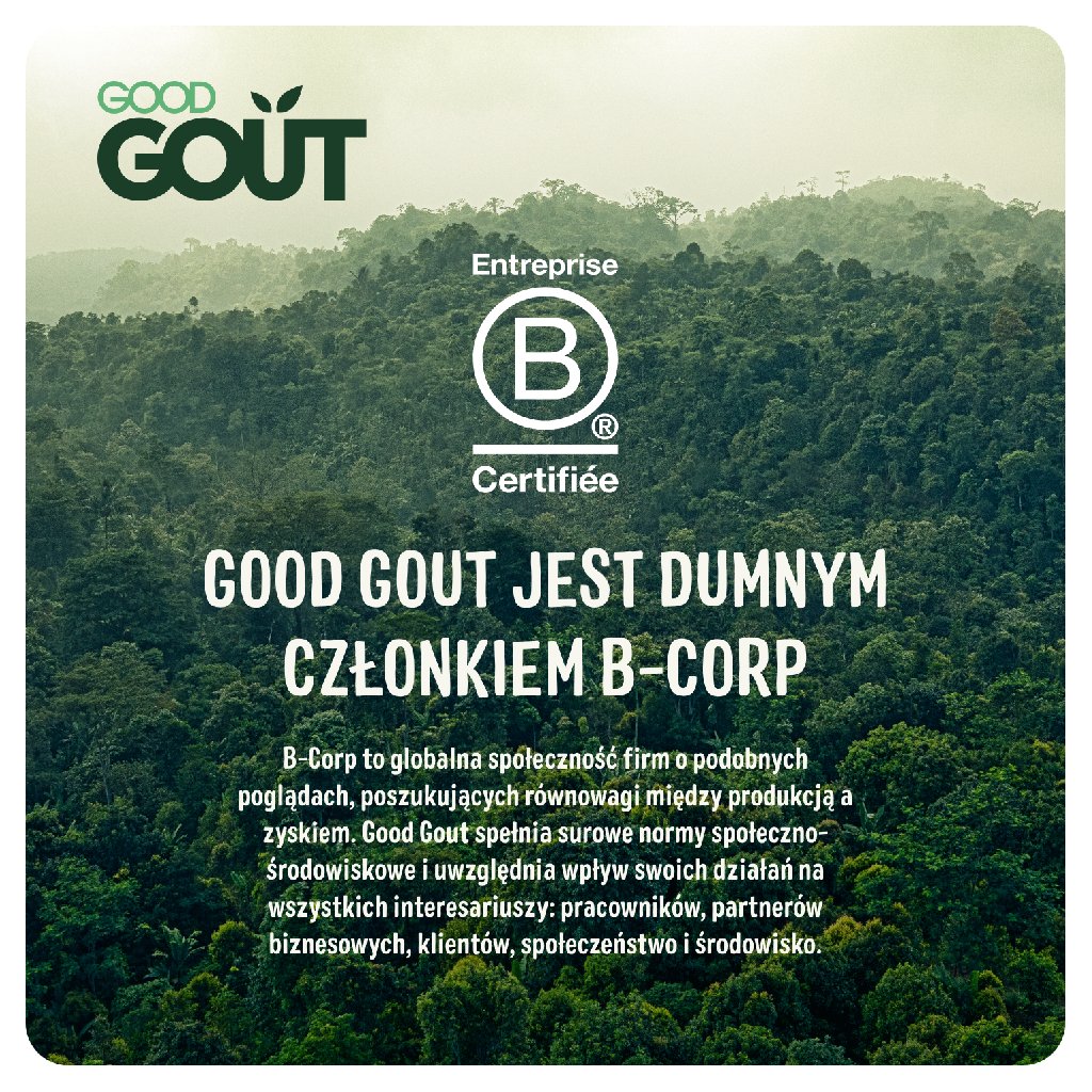 B-Corp to globalna społeczność firm o podobnych poglądach, poszukujących równowagi między produkcją a zyskiem. Good Gout spełnia surowe normy społeczno-środowiskowe i uwzględnia wpływ swoich działań na wszystkich interesariuszy: pracowników, partnerów biznesowych, klientów, społeczeństwo i środowisko.