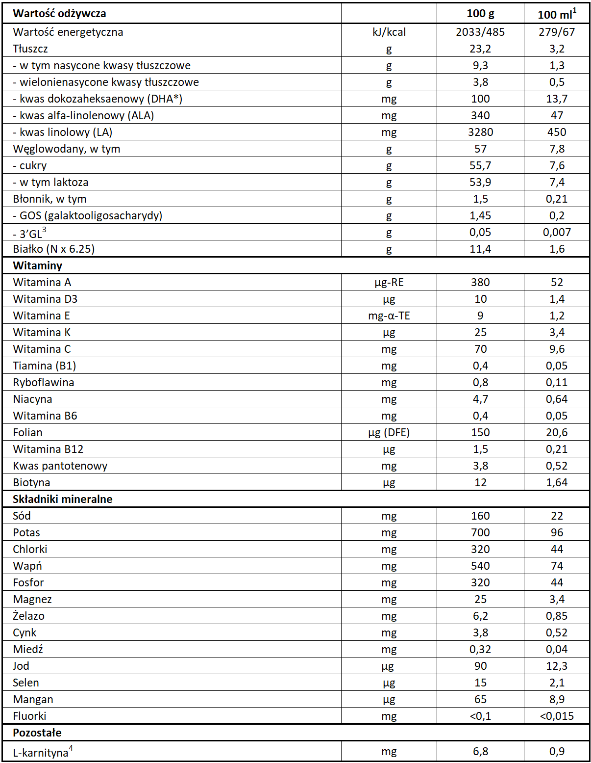 BIO mleko pełnotłuste (191,2 g płynnego mleka na 100 g proszku), BIO mleko odtłuszczone, BIO laktoza (z mleka), BIO oleje roślinne (słonecznikowy, kokosowy, rzepakowy), BIO demineralizowane białko serwatki z mleka, BIO galaktooligosacharydy (z mleka) 2,1%, mleczan wapnia, fosforan wapnia, wodorotlenek potasu, witamina C, cytrynian wapnia, olej z mikroalg Schizochytrium sp., chlorek potasu, siarczan żelaza (II), witamina E, siarczan cynku, niacyna, kwas pantotenowy, siarczan miedzi (II), tiamina, ryboflawina, witamina A, witamin B6, siarczan manganu, kwas foliowy, selenian (IV) sodu, jodek potasu, witamina K, witamina D3, biotyna, witamina B12.