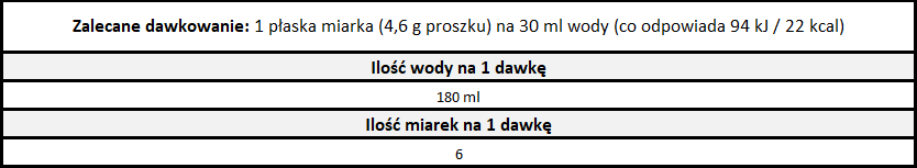 | Ilość wody na 1 dawkę | Liczba miarek na 1 dawkę |