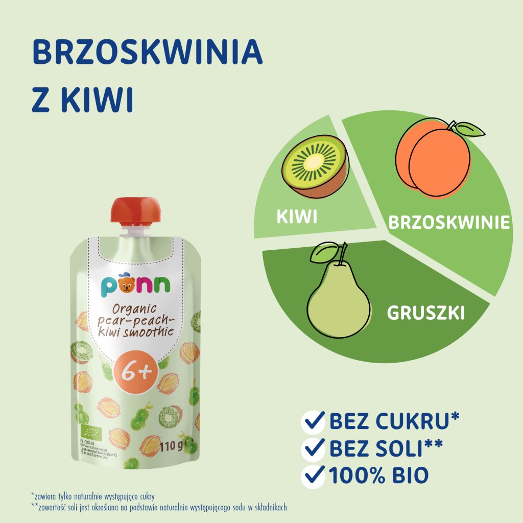 Skład: bio puree gruszkowe (55%), bio puree brzoskwiniowe (35%), bio puree z kiwi (10%).