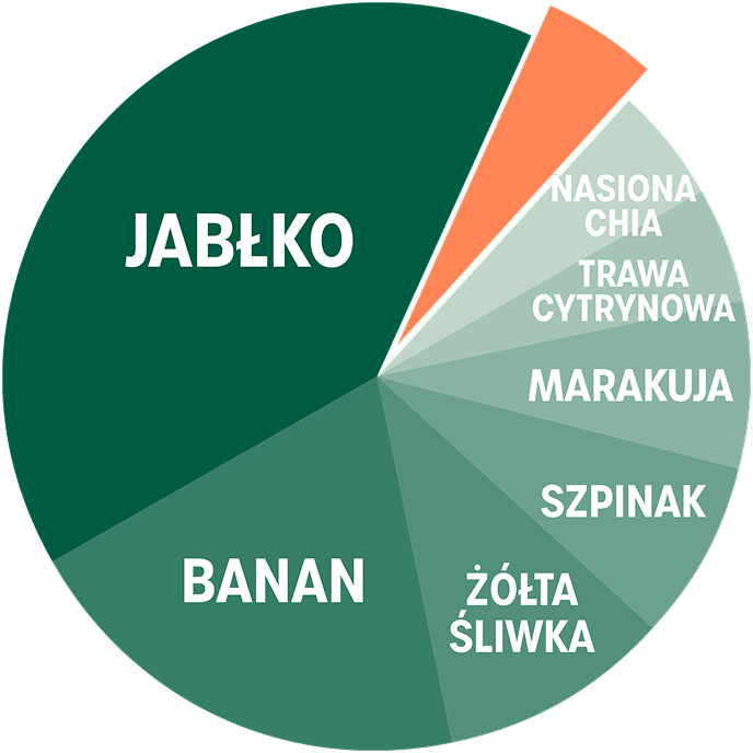 Składniki: *puree z jabłek 40%, *puree z banana, woda, *puree z żółtych śliwek 10%, *szpinak 8%, *sok z marakui, *nasiona chia (Salvia hispanica) 0,7%, *1mieszanina zielonej żywności 0,27% (spirulina, chlorella, młody jęczmień, młoda pszenica), *trawa cytrynowa. *z rolnictwa ekologicznego.