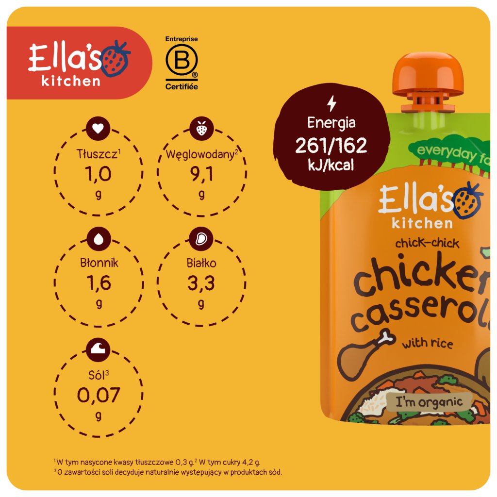 Składniki: *wywar warzywny (woda i *warzywa: marchewka, pasternak, por, cebula, rzepa) 33%, *marchewka 23%, *mięso z kurczaka 11%, *brokuły 11%, *cebula 11%, *owoce (morele, rodzynki) 5%, *ryż 5 %, mieszanka *ziół (mięta, majeranek, pietruszka, tymianek) < 1%, *pieprz ziarnisty < 1%. *z rolnictwa ekologicznego.